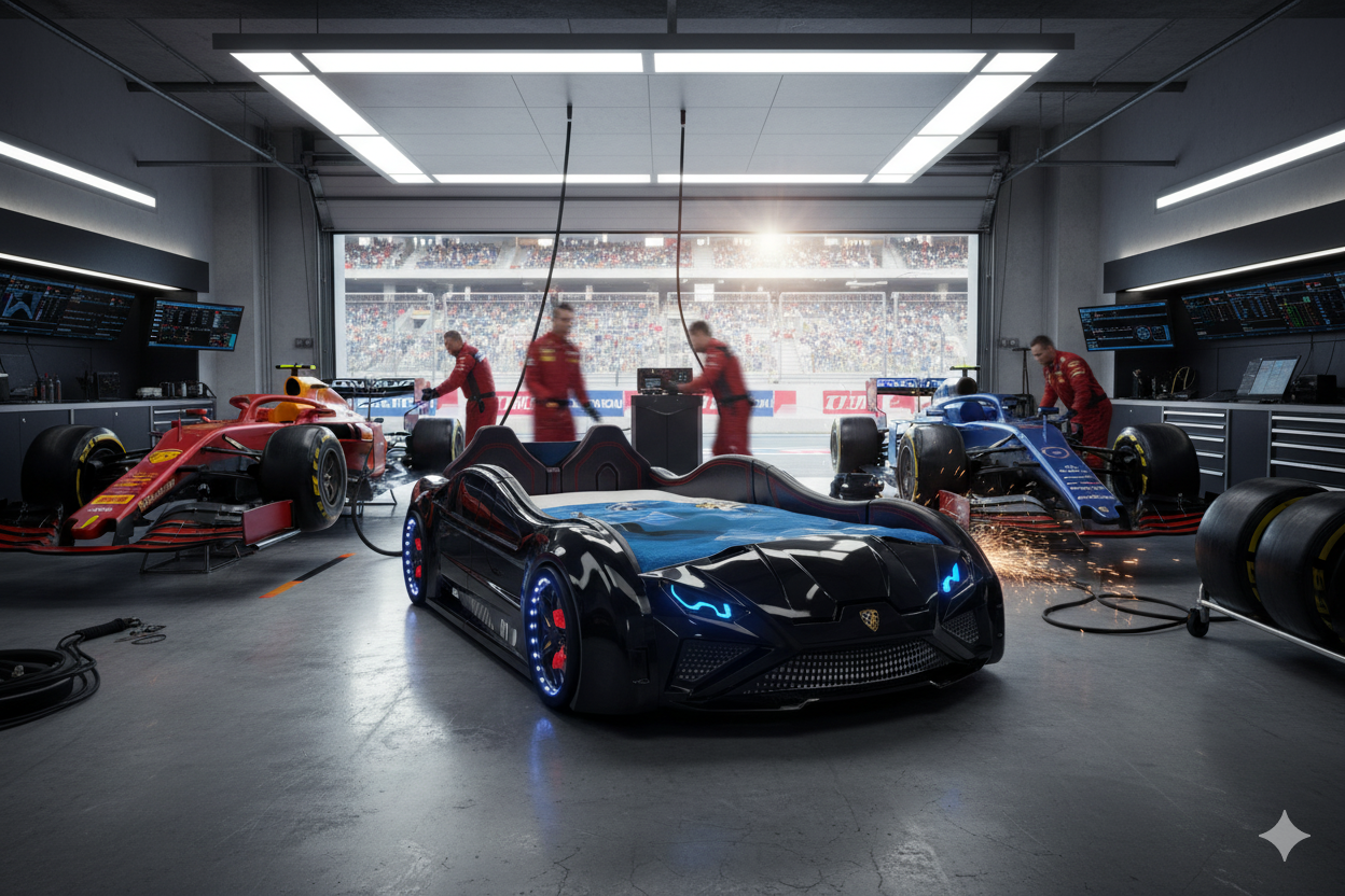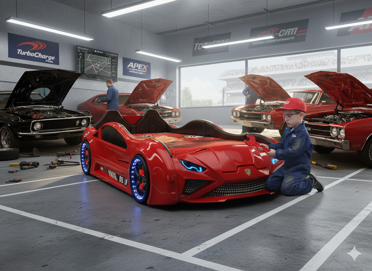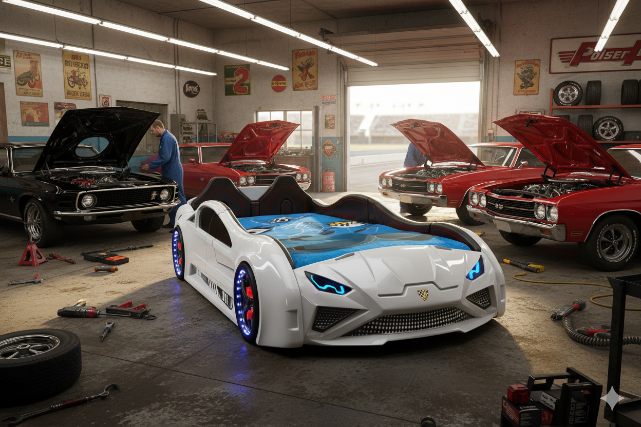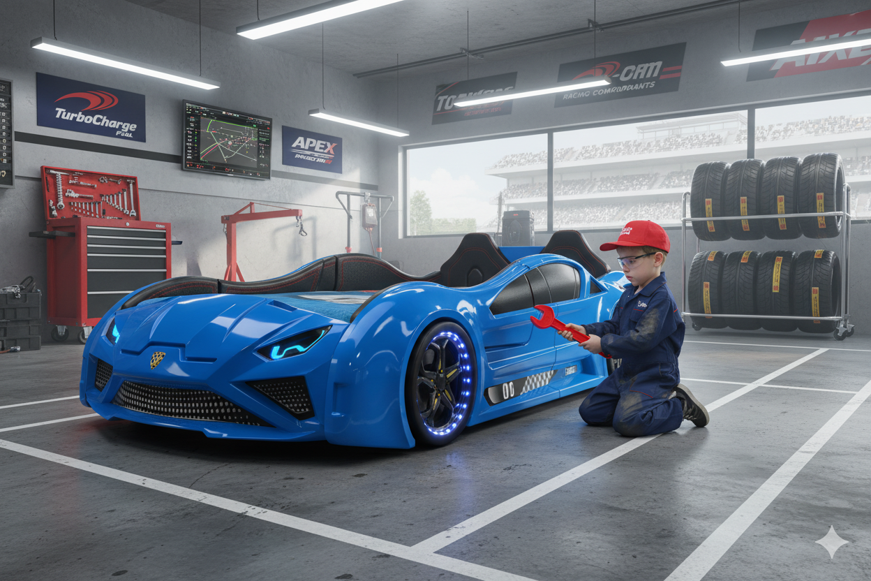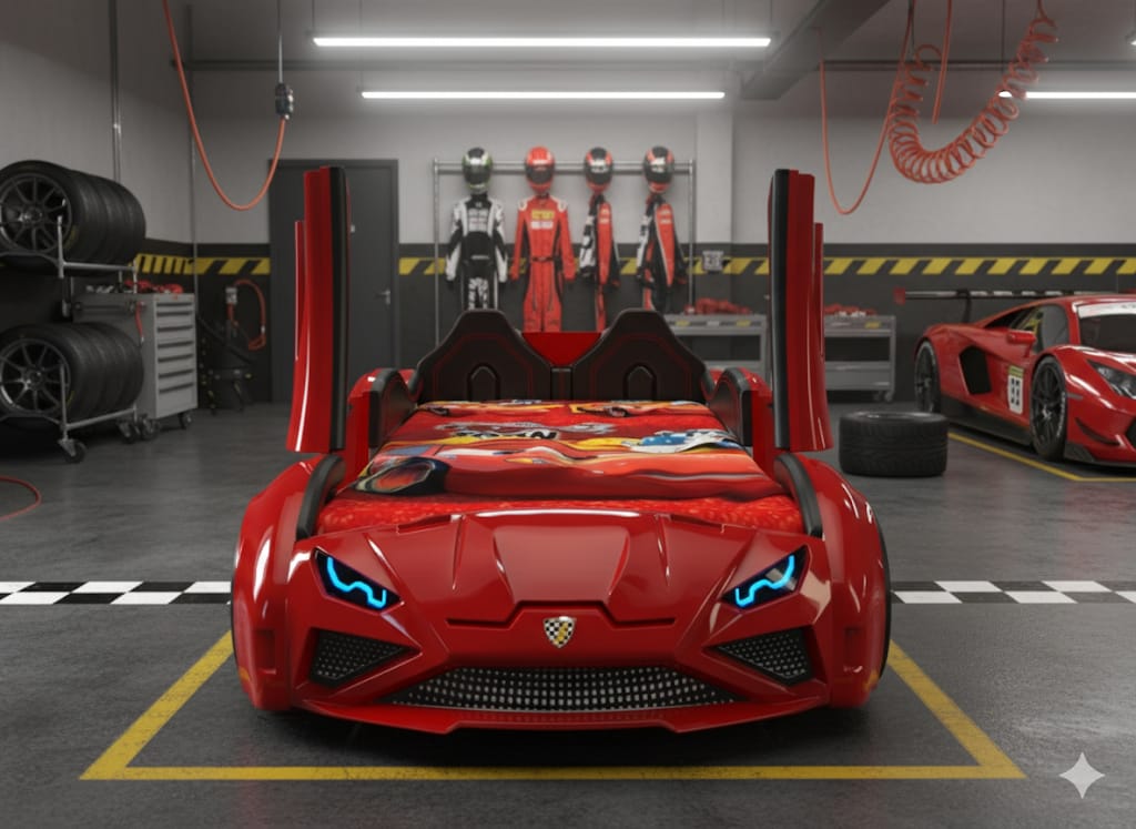 Erleben Sie mit dem Autobett Lambo Model die perfekte Kombination aus Eleganz und Abenteuer! Dieses beeindruckende Bett in vier Farben bietet sportliches Design und viele Funktionen, darunter LED-beleuchtete Felgen, Scheinwerfer und spannende Soundeffekte wie Motorstartgeräusche und Hupe. Gefertigt aus robustem ABS Kunststoff und stabiler 18 mm MDF Holzfaserplatte, ist das Bett kratzfest, wärmebeständig und wasserabweisend. Mit einer Liegefläche von 90 x 190 cm und Gesamtmaßen von 236 x 68 x 119 cm (L/H/B) bietet es viel Platz für kleine Rennfahrer. Im Lieferumfang enthalten sind LED-Frontscheinwerfer, ein 12V Adapter, eine Fernbedienung, eine Rücklehne, zwei Flügeltüren und vier LED-beleuchtete Reifen. Die Fernbedienung ermöglicht die Steuerung von Lichteffekten und Geräuschen. Ideal für kleine Autofans, die Komfort und Abenteuer lieben!