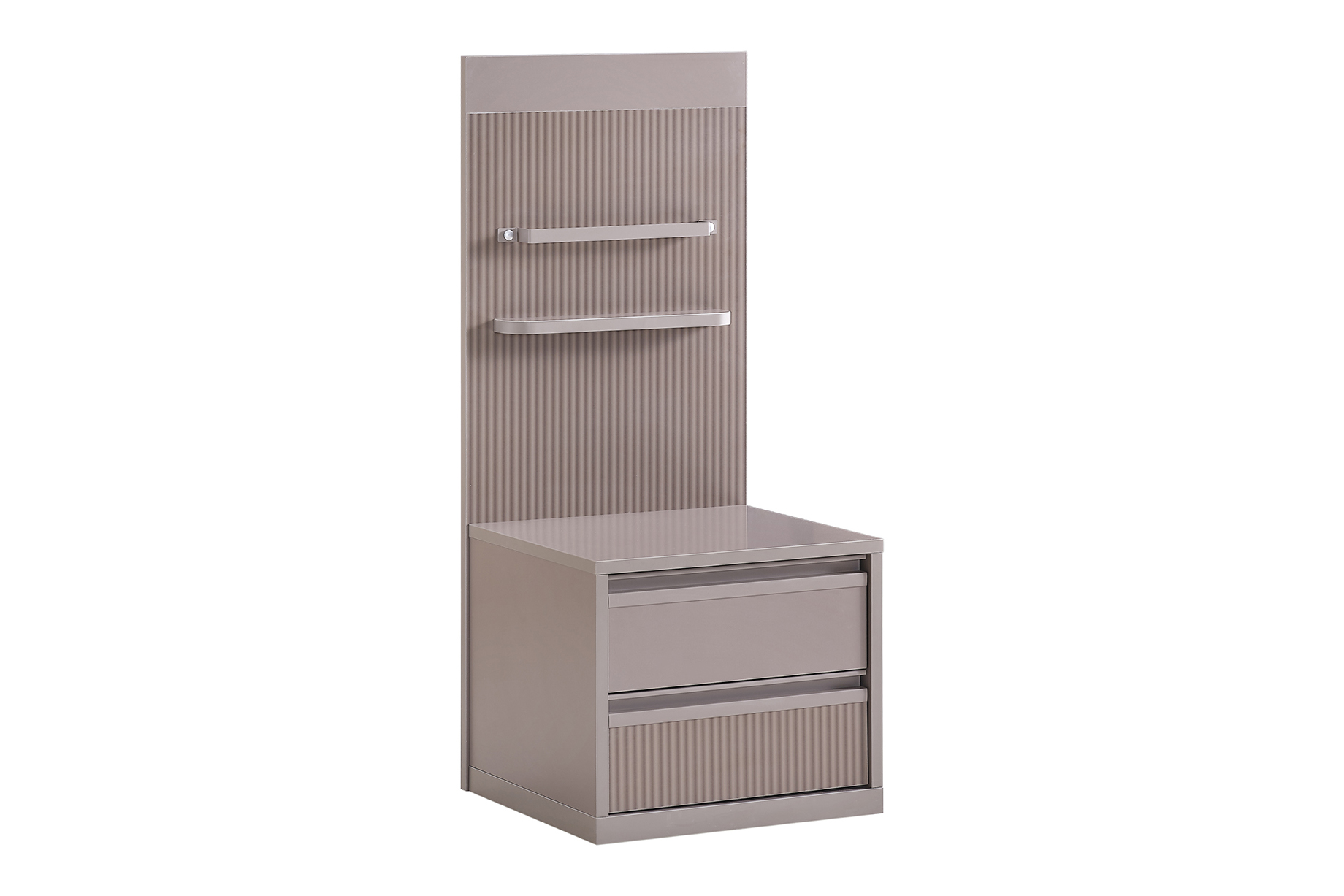Die Nachtkommode SHADOW von Kupa ist ein praktisches und auffallendes Möbelstück. Durch ihre Farbkombination in creme und beige ist sie zeitlos und sticht besonders durch die hohe Rückwand optisch hervor. Neben dem optischen Highlight ist die Rückwand sehr modern mit Riffelung gearbeitet und verfügt über ein Regal sowie eine Halterung, so dass sich zum Beispiel Zeitschriften oder Bücher dort abstellen lassen. In den beiden geräumigen Schubladen finden viele weitere Dinge ihren Platz.